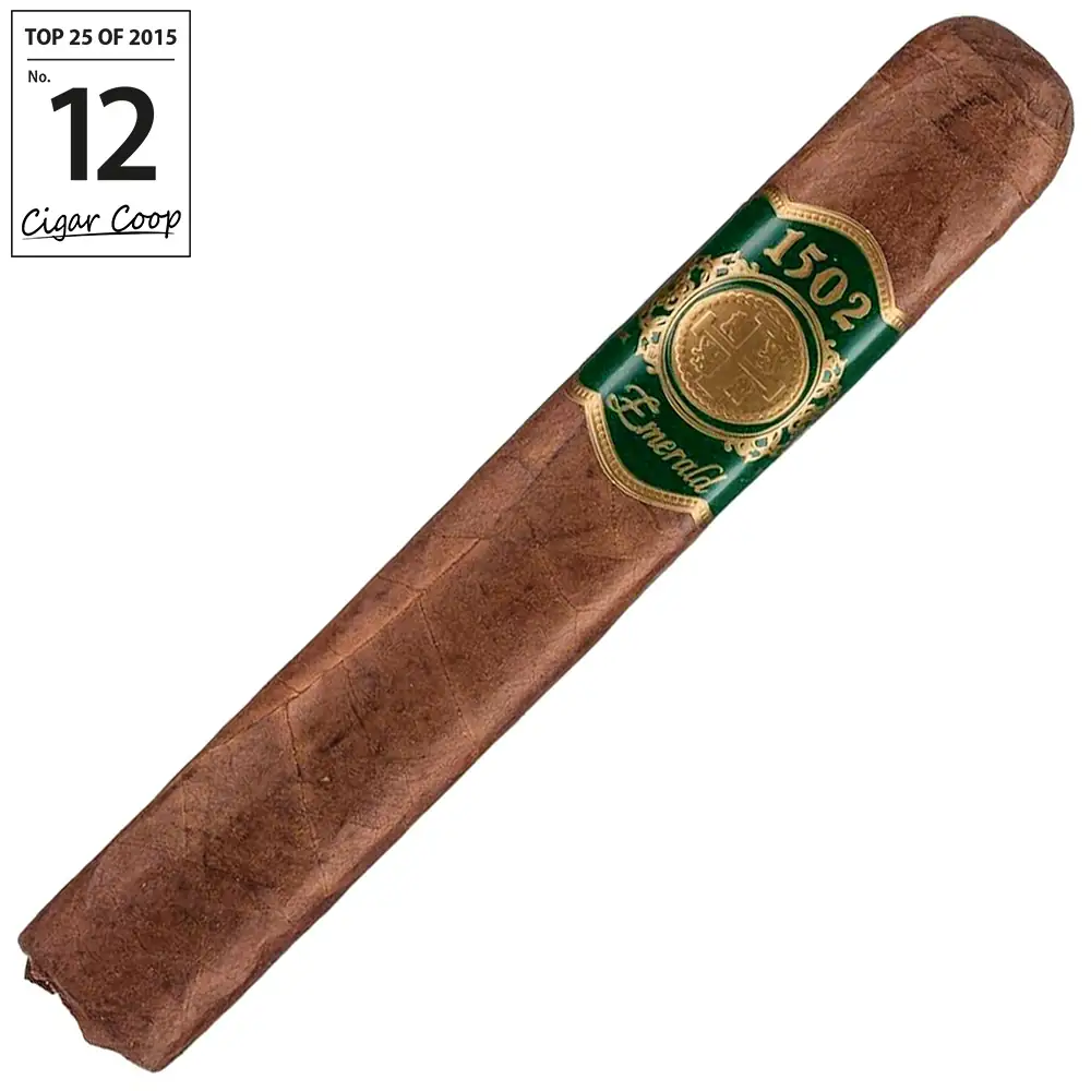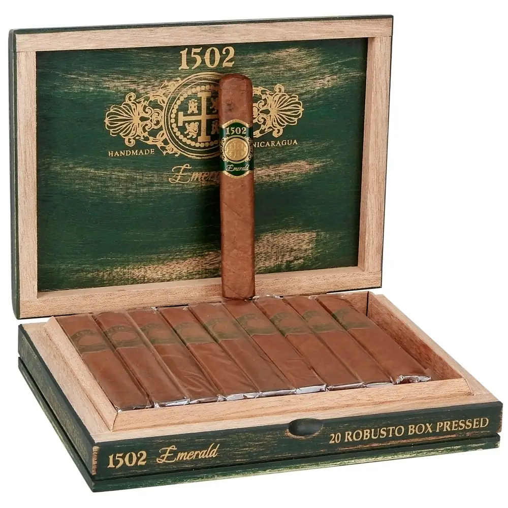 The 1502 Emerald Robusto was crafted using carefully selected aged tobacco leaves to give it its smooth, unique flavor profile. It is a mild-bodied, box-pressed stick that features a savory light-tan Nicaraguan Corojo Habano-seed wrapper placed over a Nicaraguan binder and long-filler leaves from Mexico and Nicaragua. This specially curated blend offers a palate pleasing sweetness with fruity notes and a relaxing vanilla aroma.