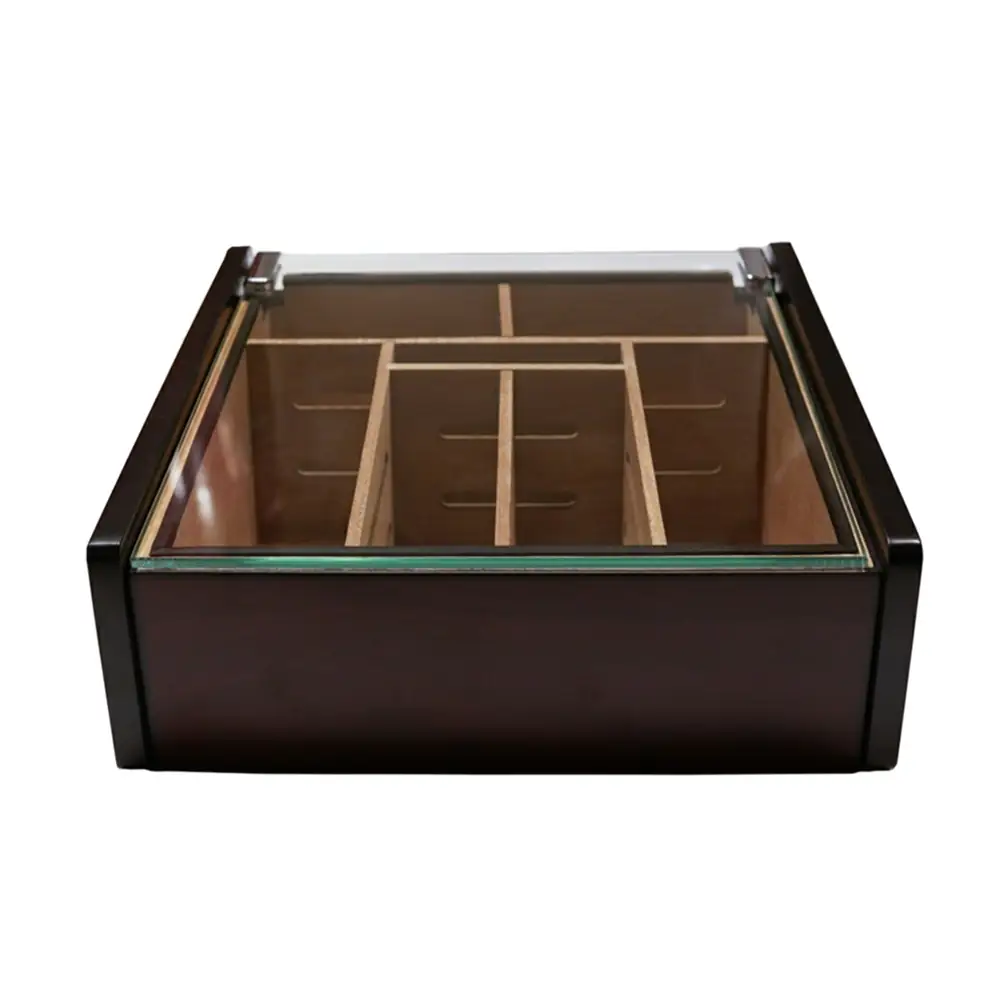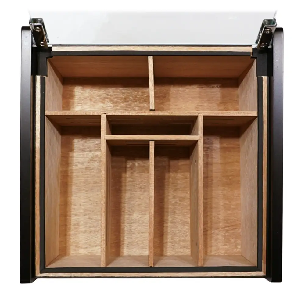 The humidor with cedar wood interior and a glass top, suitable for storing 80-100 cigars. The glass top is slightly tilted, so there is a better view of the cigars. Separate compartments can be divided into 4, 5 or 6 compartments with a separate compartment in the middle for the humidifier.