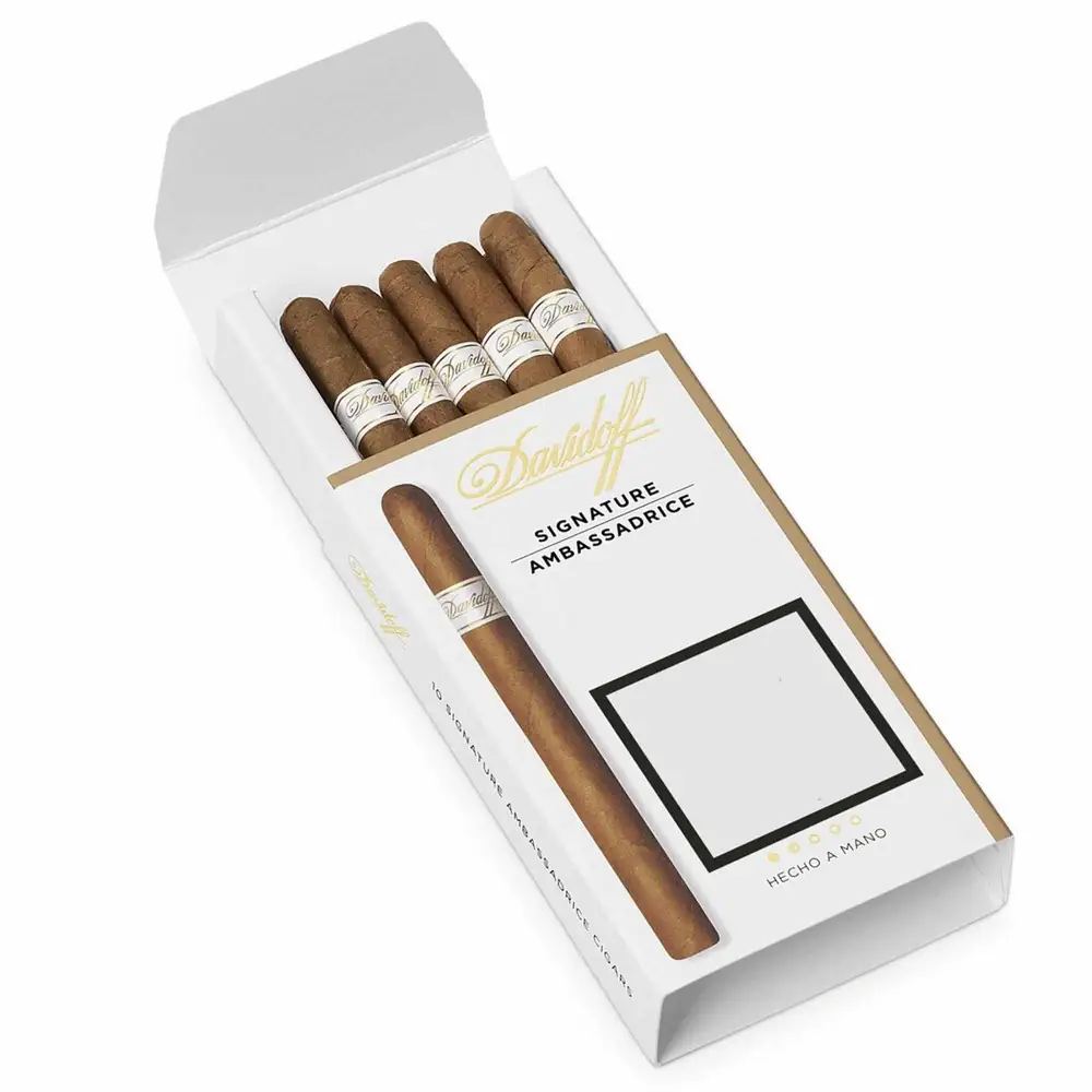 Davidoff Signature Series Ambassadrice je ručno rolana luksuzna cigara dimenzija 4,5 x 26 u tankoj i elegantnoj Señorita veličini, stručno izrađena za prožanje zemljanih i aromatičnih nijansi i mekog, kremastog karaktera vrhunskog dominikanskog blenda duhana. Davidoff Signature Series Ambassadrice omotana je glatkim i bujnim wrapperom Ecuador Connecticut prije nego što je nadalje odležana kako bi se prikazali suptilno slatki okusi vanilije s nježnim naglaskom začina cedra.