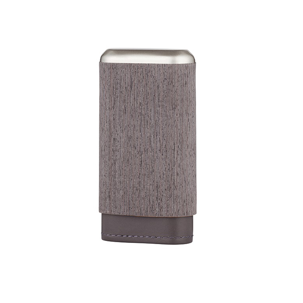 Elegantna futrola za 3 cigare Angelo od sive furnirne drvene građe sastoji se od gornjeg dijela od sive furnirne drvene građe i donjeg dijela od sive kože koji se lako umeću jedan u drugi i tako savršeno prilagođavaju veličini odgovarajućeg formata cigare.