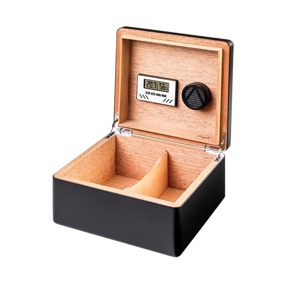 Angelo humidor crni mat je elegantna kutija za pohranu cigara s mat crnim vanjskim dizajnom i unutrašnjošću obloženom cedrovim furnirom. Opremljen je digitalnim higrometrom i polimernim ovlaživačem za održavanje optimalne vlažnosti, odvojivom pregradom za fleksibilnu organizaciju oko 75–100 cigara. Izrađen od kvalitetnih materijala, odličan je izbor za čuvanje vaše kolekcije cigara. Dimenzije: 25 x 23 x 12,5 cm.