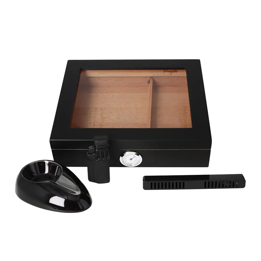 Angelo Humidor Gift Set Black je kvalitetan humidor za cigare s elegantnim crnim dizajnom i unutrašnjošću od cedrovog drva, namijenjen održavanju 20-35 cigara u optimalnim uvjetima vlažnosti. Set uključuje analogni higrometar, ovlaživač sa spužvom, odvojivu pregradu, kao i praktične dodatke poput pepeljare, futrole za cigare i rezača. Dimenzije: 26 x 22 x 11 cm.