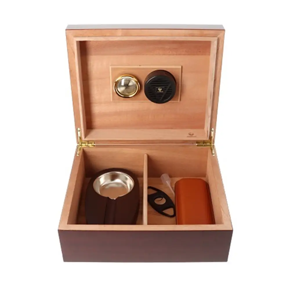 Germanus Humidor Set u smeđoj boji je klasični humidor za cigare dizajniran za čuvanje i očuvanje do otprilike 50 cigara u optimalnim uvjetima vlažnosti. Unutrašnjost obložena španjolskim cedrovim drvom pomaže u regulaciji vlažnosti i očuvanju okusa, dok ugrađeni higrometar i ovlaživač osiguravaju pouzdanu kontrolu klime. Set uključuje i osnovne dodatke za pušenje poput rezača, pepeljare i futrole za cigare, što ga čini kompletnim rješenjem za ljubitelje cigara i odličnim izborom za poklon. Dimenzije: 26 x 22,5 x 10,8 cm.