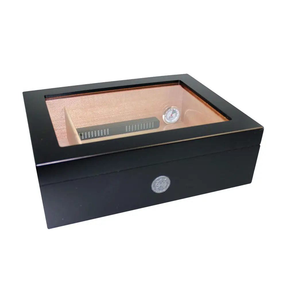 Drveni humidor za cigare sadrži kapacitet za 25 cigara, dizajniran je za dugotrajno čuvanje cigara uz stabilnu vlažnost, zahvaljujući internom sustavu ovlaživanja. Ima dva unutarnja pretinca i ugrađeni analogni higrometar. Dimenzije: 29 x 22.5 x 9.5 cm.