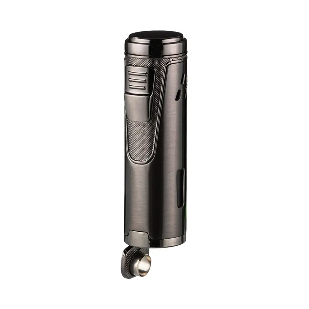 Winjet upaljač s pet mlaznih plamenova i ugrađenim rezačem cigara, u antracit boji. Zahvaljujući prozorčiću sa strane, možete provjeriti razinu plina u upaljaču. Na dnu upaljača nalazi se rezač cigara.